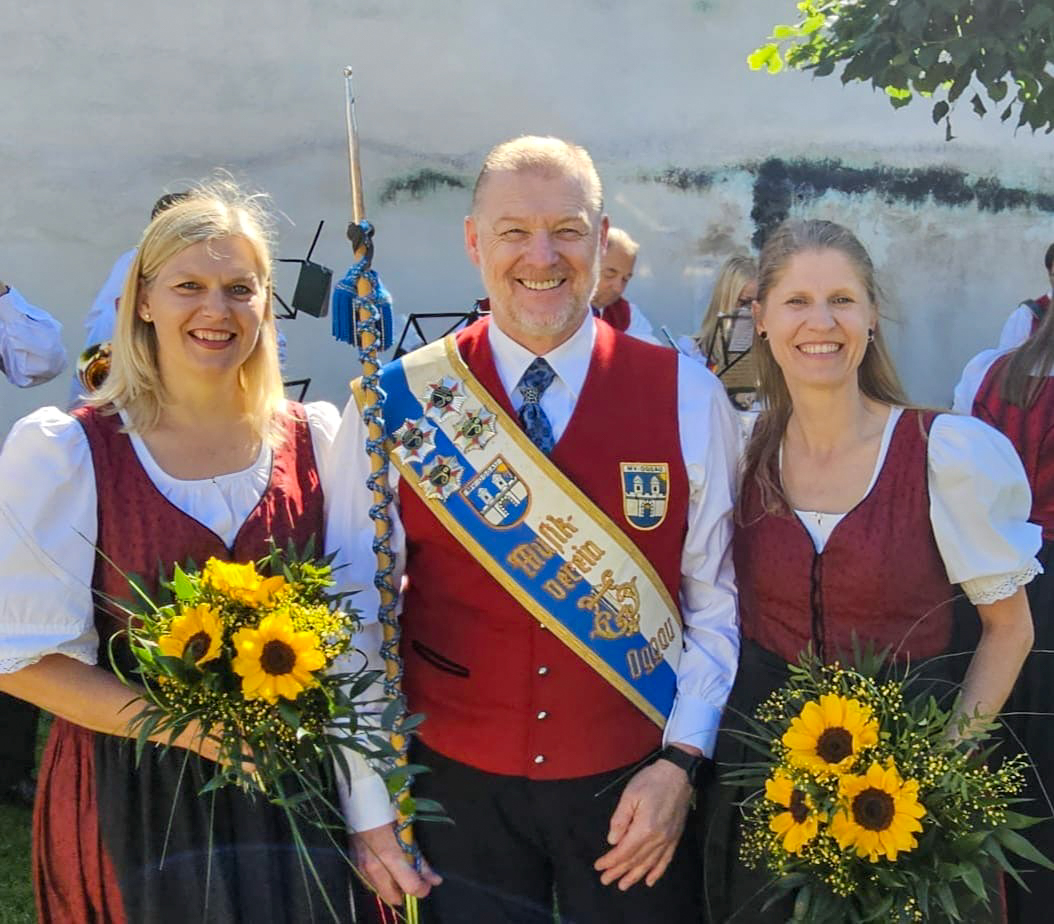 Bei der heurigen Erstkommunion zelebrierte Evelyn Kopf (geb. Jaidl) ihren „Wiedereinstieg“ als Marketenderin. Gemeinsam mit Ehrenstabführer Alexander Vargyas und Obfrau Simone Feiler marschierte sie in derselben Formation wie vor 30 Jahren. Wir freuen uns sehr, Evelyn wieder bei uns begrüßen zu dürfen!